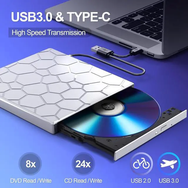 (Note: SD and TF card cannot be used at the same time). ^^ USB 3.0 HIGH-SPEED DATA TRANSFERCD Burner with high speed USB 3.0 technology, many of the port cluster connectors are labelled by blue color and backward compatible with USB 2.0. USB 3.0 is an updated version of USB 2.0 which provides higher data transfer rates up to 5 Gigabits/S (625MB/S). It is approximately 10 times faster than USB 2.0. Besides that, The cd drive offers Max 8x DVDR Read Speed and Max 24x CD Write/Read speed, faster than you expected. ^^ Plug and Play The external DVD drive is powered by a USB 3.0 port, no internal DVD driver and external power required, is the perfect companion for laptop or desktop that can be used directly by plugging it into USB port. No need for additional drivers. PLUG and PLAY. The CD Rom external drive for laptop has strong error correction, anti-skid and quiet capabilities. ^^ Wide CompatibilityThe optical drive supports reading and writing of CDR/RW, CD-ROM, DVDR/RW, DVD-RAM, VCD, and SVCD. In addition, This USB-A and USB-C external disk drive supports different devices such as Macbook, iMac, Notebook, Desktop, and Laptop, etc.