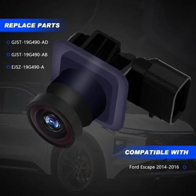 Backup CamerasReplace Parts: GJ5T-19G490-AD, GJ5T19G49-ADGJ5T-19G490-AB, GJ5T19G490ABEJ5Z-19G490-A, EJ5Z19G490A590-419, 590419Compatible with2014 Ford Escape 2.5L L4 S/ S Plus/ SE/ SE Plus Backup Camera2014 Ford Escape 2L L4 Titanium / SE Backup Camera2015 Ford Escape 2.5L L4 Trend/ Titanium/ S/ SE Backup Camera2015 Ford Escape 2L L4 Trend/ Titanium/ SE Backup Camera2016 Ford Escape 2.5L L4 Trend/ Titanium/ S/ SE Backup Camera2016 Ford Escape 2L L4 Trend/ Titanium/ SE Backup CameraFunction Description: The rear view camera is used on the car parking or driving, it activates automatically when reverse gear is selected or manually via the central display, has High-resolution camera and ultra high-definition imaging, show up the reversing tracking line accurately, can assist the driver when manoeuvring in tight spaces by indicating obstacles with a camera image and graphics in the centre display. Better picture processing and sensing technology than most similar products. Replace your old camera to get a clearer reversing view and safety protectionMaterial and
