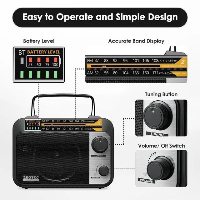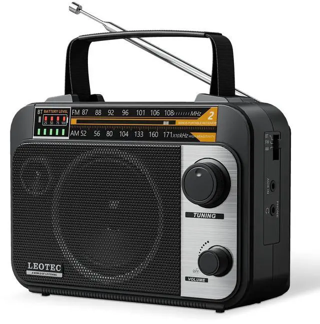 Compact Design But Clear Sound - LEOTEC portable radio with handheld rope, easy to carry, delivers crystal-clear sound with its powerful speakers, allowing you to enjoy your favorite radio stations with exceptional audio quality, Great Reception with Retractable Copper Telescopic Antenna, Bluetooth Speaker, Auxiliary Input, 3.5 mm Phone Jack, AC/DC/Rechargable, Battery Level Display ^^ Multiple Function - Both AM(52-171kHz)and FM(87-108MHz) radio bands with strong reception, so you can easily tune in to your favorite stations; Audio indicator light When played with music, the audio indicator lights flickering with the music; The small radio has a headphone jack, so you can listen your favorite stations to plug in any headphones with a 3.5 millimeter jack in private; Battery level kept track battery indicator easily and conveniently ^^ AM FM Radio Bluetooth Wireless Connection - This radio is a high quality audio device with excellent sound quality and portability.
