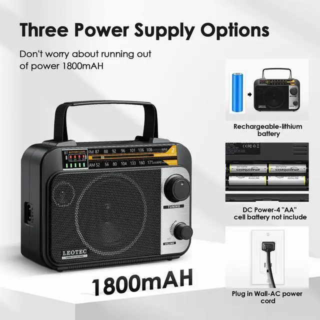It easily connects to your cell phone or other Bluetooth-enabled devices, allowing you to enjoy high-quality music and radio programs anytime, anywhere. It also features a compact design and lightweight, making it perfect for traveling, camping and outdoor activities. Whether you are at home or outdoors, this easy-to-carry radio is ideal companion for you ^^ Rechargable/AC/DC-Three power options of this FM Radio is available in Rechargeable with 1800mAh lithium battery, when working with lithium batteries, the power indicator light will be on, showing the remaining state of the power of the lithium battery, 10 hours of continuous operation on a full charge.