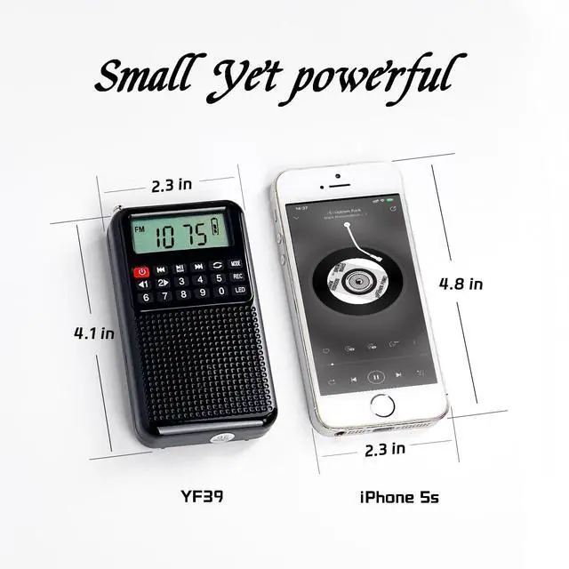 Portable and On-the-Go CompanionElevate your on-the-go lifestyle with our mini portable radio AM FM, effortlessly held in one hand for unparalleled convenience. As portable as an iPhone 5s, its compact dimensions of 59*106* 18.5 mm and a weight of only 107g make it a seamless addition to emergency kits. Whether you're on the move or unwinding indoors, our mini AM FM radio effortlessly blends fashion and portability, turning your morning exercise, strolls, or park breaks into vibrant experiences with delightful music or engaging radio shows. ^^ User-FriendlyAfter a busy day, find solace in simplicity with our easy-to-use rechargeable battery-operated radio.