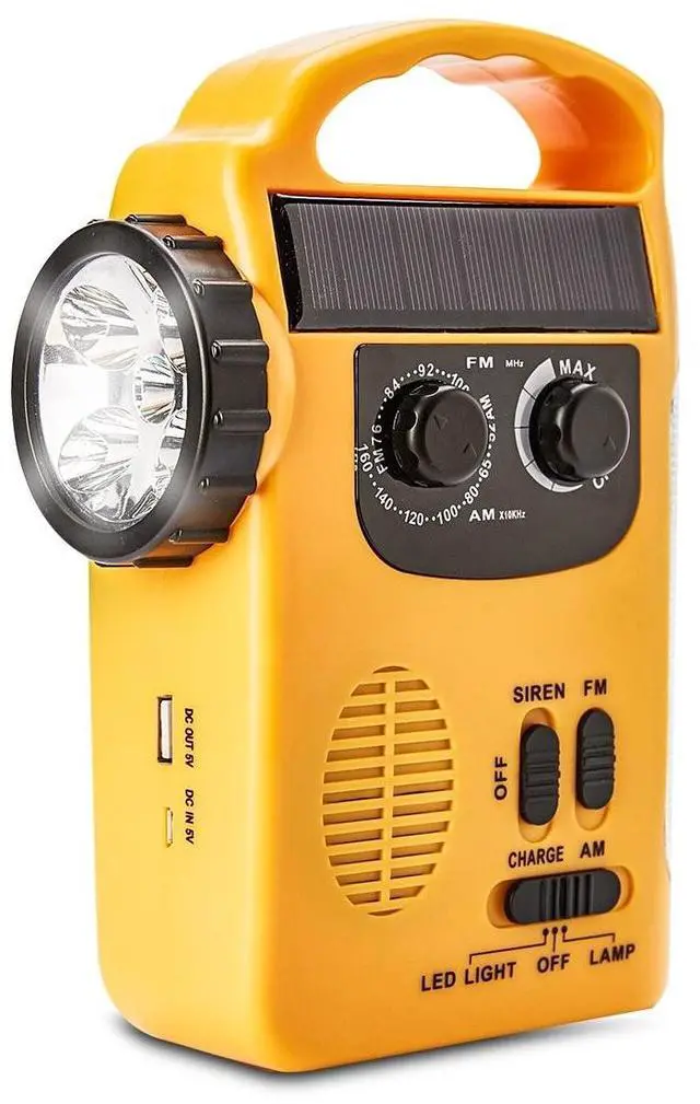 KHz to 1710KHzFM: 87.5 to 108 MHz or 76-108 MHzFOUR-WAY TO CHARGE POWERMicro USB charge powerCharge full within 6-7 hours. Don't charge it more that 8 hours. Solar panel35-60 mAh when changing the batteries. Can be fully charged under the direct sunlight for over 15 hours. Hand crankBy one minute of winding(130 turn/minute) 5 LED can last 12 mins, LED lamp last 8 mins, radio can play 25 mins which depending on volume. 3 * AA Dry batteriesPREPARE FOR EMERGENCY4 kinds of charging methods to ensure that in any case will not power shortageBuilt-in warning device and speaker. Siren sound level up to 90 dB. Super bright flashlight with 5 LED, emergency lamp with 8 LED. Turn the Change Button on and use the wind up charging, can charge for mobile phone. NOTICEWhen hand cranking to charge, please make sure all the function is turned off, especially charging for the mobile phone or other digital products. Mobile phone charging function is only recommended for use in emergencies because of the not high conversion efficiency. battery will be cut off if you add 3AA battery. Please take out the dry batteries when unused.
