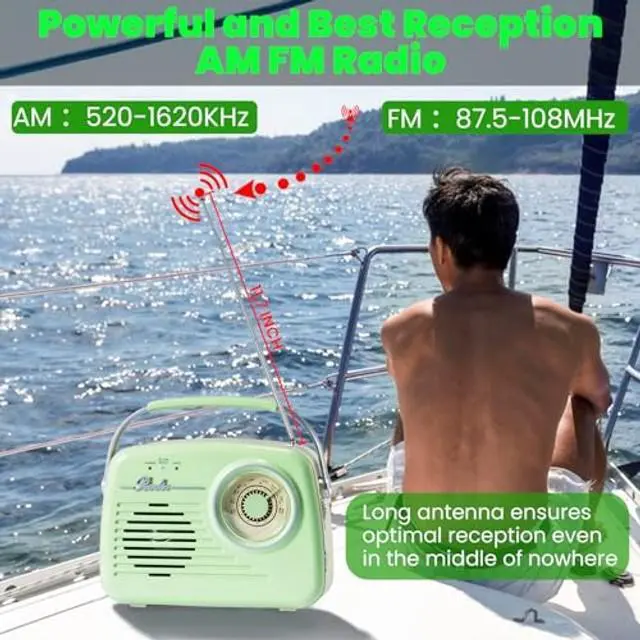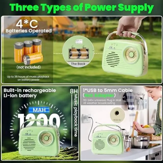 Radios Portable AM FM: This cute radios portable am fm comes with a large handle for easy portability, weighs as much in your hand as your everyday cell phone, so you can enjoy the radio without the burden, whether you're planning a camping trip or lounging in the backyard. (Measuring 8.3 x 2.1 x 5.9 inches and weighs only 1 lb). ^^ AM/FM FunctionFrequency range- FM 87.5 -108MHz and AM 520-1620KHz. The AM FM signal may have some difference, such as the distance between Broadcast Signal Transmission Tower and your location, or Receiving radio signals in a confined space can result in weak or inaudible signals. ^^ Three Power Supply OptionsThis vintage radio built-in 1200 mAh battery for long time standby music playback for up to 8 hours; When camping outdoors, plug 4 C-cell batteries (not included) into the battery-operated radio to enjoy long hours of use wirelessly; When using in the bedroom, kitchen or office, plug the charging cable (Not Included USB Adapter) into the wall to enjoy the radio all day long. ^^ Easy to Operate UseThis am/fm tuning dial and scale is larger and clearer than ever before, making it easy to fine-tune the desired station.