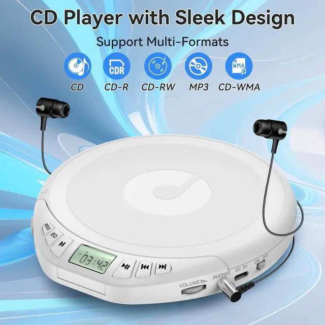 Sleek Portable CD Player: Compact CD player features a timeless black finish with a recognizable musical note logo for unique visual effects. Designed for ultimate portability, slim, lightweight bring you a perfect music experience when walking, hiking, sporting, staying at home and Traveling in car. ^^ Premium