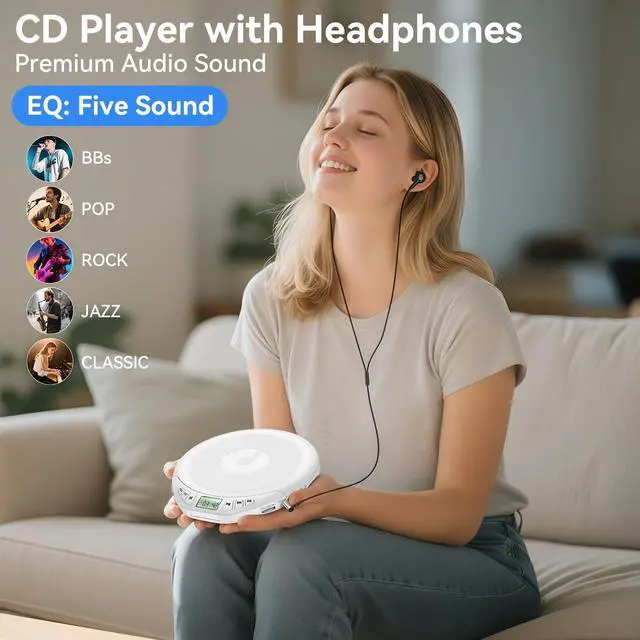 Audio Sound Quality: Experience crystal-clear sound powered by a professional intelligent digital noise reduction chip, meanwhile discman cd player equipped with 5 sound effects(BBS, Pop, Rock, Jazz, Classic) delivering a high-fidelity listening experience.