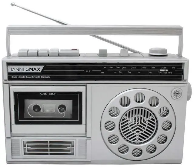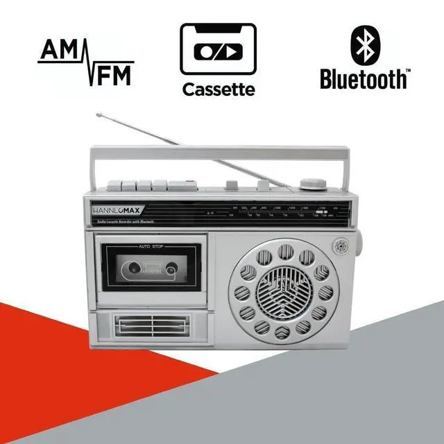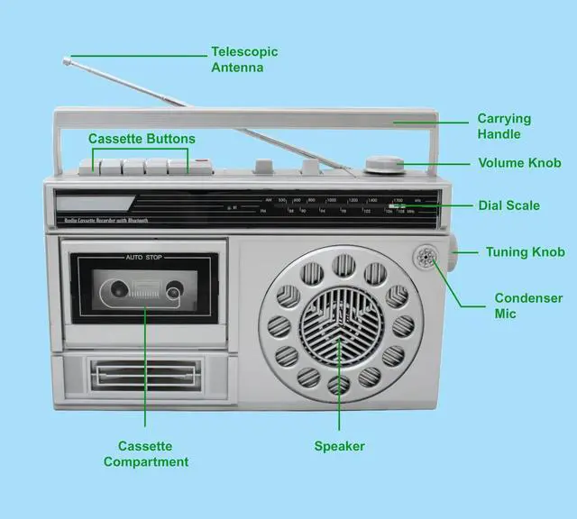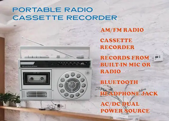 Portable AM/FM Radio Cassette Recorder with Bluetooth, Records from Built-in Mic or Radio, Headphone Jack, AC/DC operation.