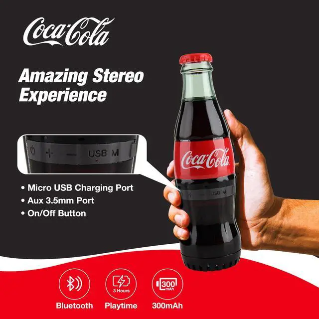 LONG PLAYTIME: Chargeability is one of the most important features of the new Coca Cola Bottle Shaped Bluetooth Speaker, which has a pretty impressive battery life that can make it possible to enjoy music outdoors continuously. Don't worry about it; just charge it so you can take your bottle speaker wherever your adventures take you. Also we offer a complete package with the charging cable as well as AUX included.