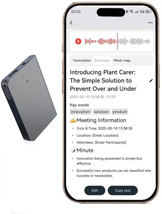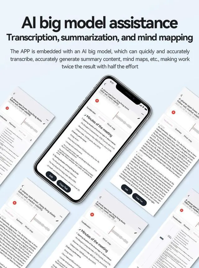 With a storage capacity of 64GB, over 540 hours of audio can be stored, making the device ideal for regular use and recording phone calls. ^^ AI Recording AssistantThe AI Voice Recorder with writing function is not only a recording device, but also a powerful assistant for your work and your life. Thanks to its powerful AI feature, it is able to provide a whole range of recording, transcription and summary services that will help you dramatically improve your work efficiency and productivity. ^^ Robust data protection and securityKeep your recordings private, files stay safe on your recorder and phone, with password protection for added security.