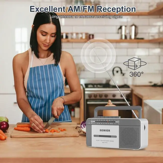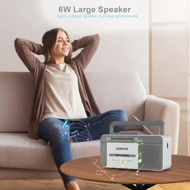 Versatile Audio Playback Enjoy your nostalgic music collection with our radio cassette player boombox, designed to play your collected tapes while also allowing you to record external voice and radio into cassette using the built-in microphone. ^^ Superior Reception Equipped with a long antenna and an upgraded DSP chip, this cassette tape player guarantees the best AM/FM reception, covering AM frequencies from 520-1710 kHz and FM from 87-108 MHz, ensuring clear and reliable sound. ^^ Powerful Sound Quality Featuring a robust 6W speaker, this cassette player boombox delivers excellent sound quality whether you are playing tapes or listening to the radio.