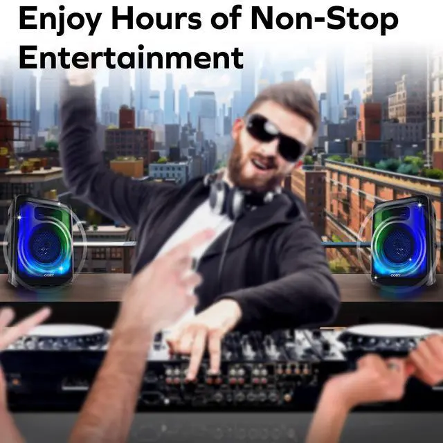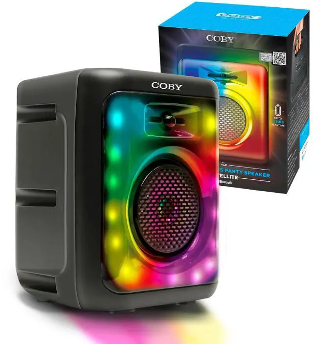 WIRELESS BLUETOOTH PARTY SPEAKER WITH LED LIGHTS: Turn any space into a party with this Coby portable Bluetooth speaker featuring Bluetooth 5.3 connectivity and a 30-foot wireless range for seamless streaming. With 11 dynamic LED light modes that sync to your music, this speaker creates an immersive audio-visual experience perfect for birthdays, holidays, beach days, camping trips, dorm rooms, and backyard gatherings. ^^ BUILT-IN KARAOKE MODE WITH MULTIPLE INPUT OPTIONS: Host unforgettable karaoke nights using the microphone input (mic not included). Connect via Bluetooth, plug in through the aux input, or play directly from USB, SD, or TF cards for versatile listening. Pair a second compatible speaker (not included) using True Wireless technology for enhanced stereo sound and louder performance at parties or events. ^^ FM RADIO +
