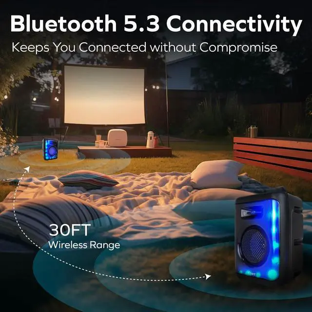 TRUE WIRELESS PAIRING: Enjoy more than just streaming. This speaker includes a built-in FM radio for local stations and supports True Wireless pairing for dual-speaker stereo performance. Whether you're indoors or outdoors, this speaker adapts to your entertainment needs with powerful sound and vibrant lighting effects. ^^ 7