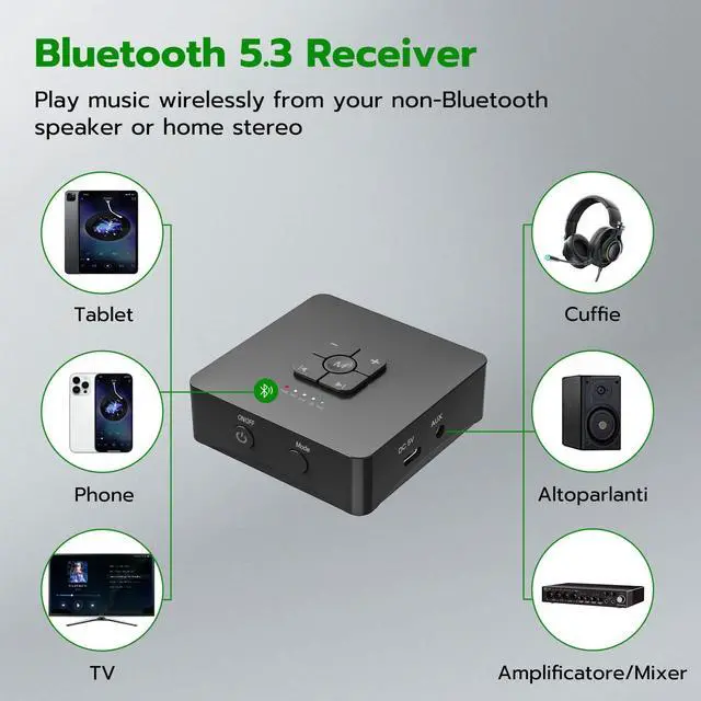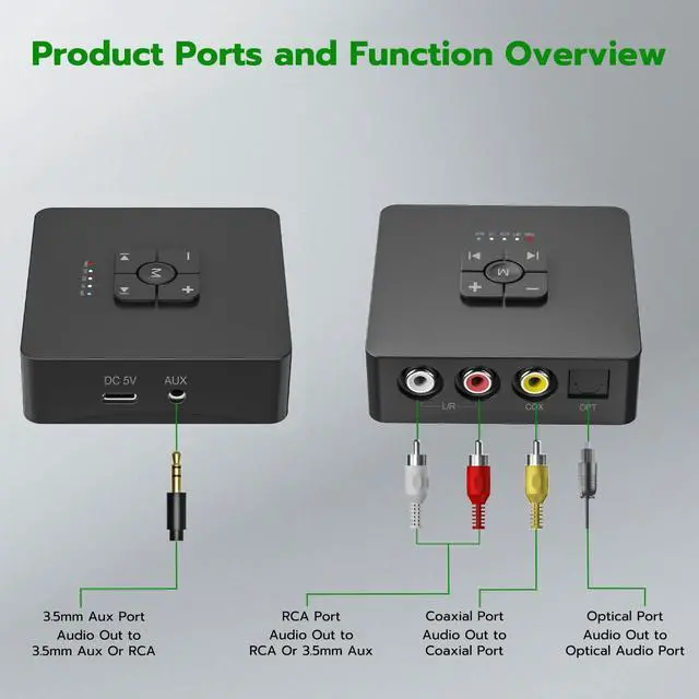 V 5.3 BluetoothUltrbeka bluetooth for old stereo receiver adopts version 5.3 upgraded Bluetooth chip. Provides a more stable and uninterrupted connection and a longer transmission distance of up to 20M. ^^ Immersive Audio ExperienceThe Ultrbeka bluetooth to rca adapter's high quality audio, low latency technology, and noise cancellation give you a truly immersive experience with audition synchronisation. ^^ Wide Compatibility The Ultrbeka Bluetooth receiver for home stereo is equipped with an output port that allows you to connect two different devices at the same time. Wide compatibility will connect home theatres, MP3/MP4, computers, TVs, Hi-Fi receivers, headphones for music streaming sound systems to the Bluetooth for old stereo receiver.