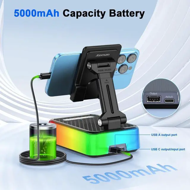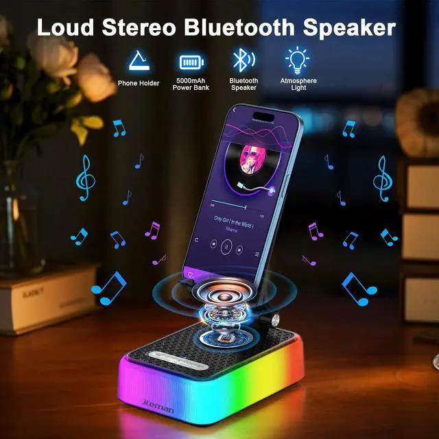4-in-1 Multi-function Bluetooth SpeakerMore than just a speaker, this is your all-in-one entertainment hub, immersive stereo sound perfect for music, games, movies, and parties. It also features a built-in phone holder, an 11 mode RGB light system, and a 5000mAh portable capacity batteryall packed into one sleek unit. ^^ 5000mAh Reliable Charging FunctionKeep your devices charged wherever you are. With a 5000mAh battery, it efficiently powers up smartphones and tablets. Enjoy up to 40 hours of playtime at 50% volume. Its compact size makes it a perfect travel companion for daily adventures.