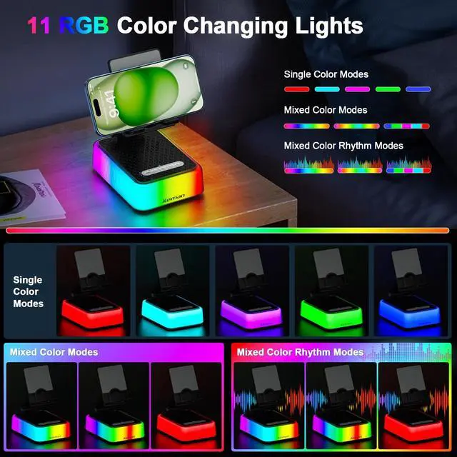 ^^ Dynamic Light Sync to the BeatChoose from 11 RGB lighting modes5 solid colors modes and 6 mixes modes(3 of these modes sync to your music, creating a vibrant light show that moves with every beat). ^^ Adjustable & Widely CompatibleThe built-in phone stand offers flexible height and angle adjustments, securely holding most smartphones, tablets, and e-readers from 4 to 13 inches. Connects easily via Bluetooth to phones, tablets, and computers. ^^ The Perfect Tech Gifts for AnyoneA standout gift for any occasionChristmas, New Year, Father's Day, Mother's day, Anniversary, Graduation, Retiremen, Teacher appreciation, Thanksgiving, Weddings housewarmings and more.