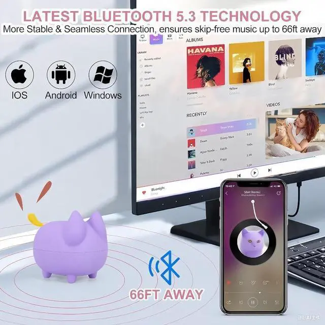 Compact Design: This portable Bluetooth speaker features a small cat-shaped design that is irresistibly adorable. It's perfect for adding a touch of cuteness to any space. Small size and lightweight, 3.54 *2* 2.6 inch, This cute speaker is perfect for a handbag/backpack and pocket. You can enjoy music with this small wireless Bluetooth speaker home and travel. It is also the cute home/desk/office/room decoration ^^ Convenient and