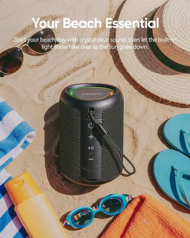 The built-in lanyard lets you hang it on a beach umbrella, bike, or shower caddyso your music stays close, wherever you are ^^ Dynamic Light Show Sets the Vibe Day or Night As the sun sets on the beach, let the beat-syncing LED lights turn your bonfire gathering into a glowing party. By day, its a fun accent for poolside lounging; by night, it transforms your bedroom, dorm, or backyard BBQ into a mini celebration. The lights dance to your music, adding energy to every momentwhether you're hosting or just chilling ^^ Crystal-Clear Sound & 15H Battery From Sunrise to Late Night Powerful 15W (20W peak) audio with zero distortion fills the spacewhether you're on a crowded beach, in the living room, or cooking in the kitchen.