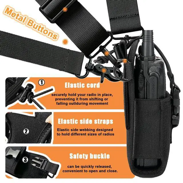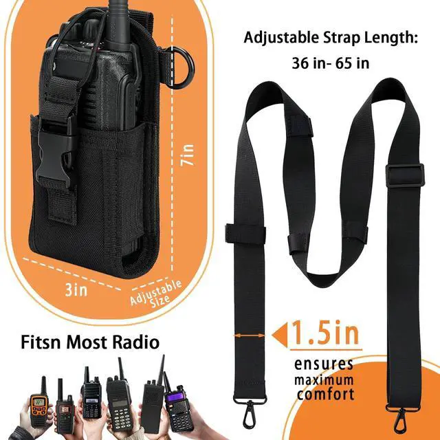 ^^ Crafted from rugged, nylon material, tough hardware, our radio strap and holster with sway strap bundle set built to withstand the demands of harsh environments and intensive use. The reinforced stitching and durable construction provide maximum durability, ensuring that your radio is well-protected from impacts, moisture, and debris. ^^ Securely hold radios of all sizes. one full size radio holder, police, ham, marine, FRS, walkie talkie, portable radios or GPS scanner. The adjustable drawstring retention strap securely hold your radio in place, preventing it from shifting or falling out during movement or vigorous activities.