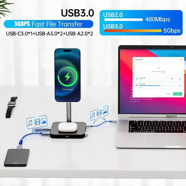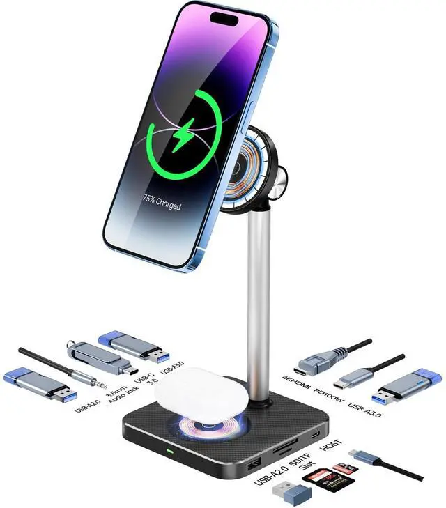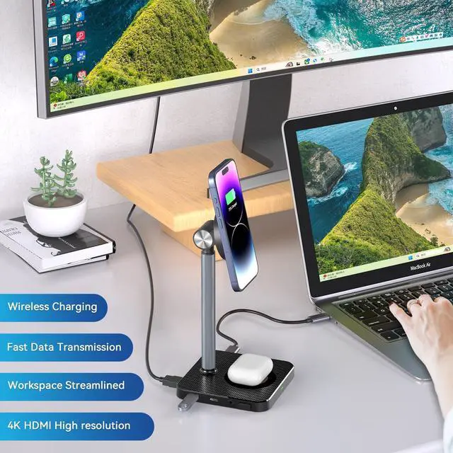 Hub+ Wireless charger+ Magnetic stand All-in-One (12-in-1)To bring you the greatest convenience with a clean and tidy workspace, weve consolidated a USB-C Hub with 10 ports for Laptops and Tablets, along with a Magnetic Charging Stand and a Wireless Charger, into one streamlined solution. Enjoy the effortless way to keep your iPhone and AirPods powered up as you work. For other brands of smartphones, as long as your phone is equipped with wireless charging functionality, its also applicable ^^ 10 Ports USB C Docking StationIts for all types of Laptop and Tablet with a USB-C port and iPhone 15 series.