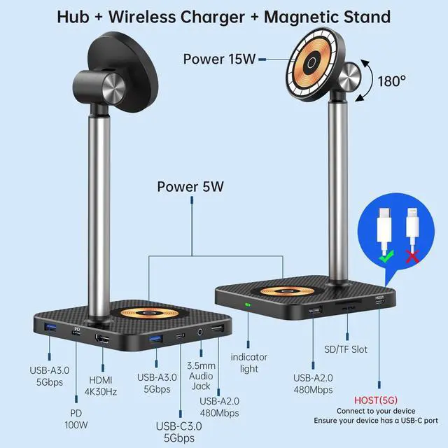 It comes with 1x PD 3.0 100W Fast charging port, 2x USB-A 3.0 ports, 1x 4K HDMI((3840x2160@30Hz), 1x 3.5 mm Audio Jack, SD/TF Card Slots, 2x USB-A 2.0, 1x USB-C 3.0 port, and 1 Host(USB-C 3.0 ). Before use please connect USB-C port of your device to Host using the included cable For HDMI use, your device needs a USB-C port ( 3.0 or higher) with video output support ^^ Wireless chargingThe Magnetic wireless charging stand on top is compatible with MagSafe iPhones(including iPhone 15 & Plus/Pro/Pro Max, iPhone 14 & Pro/Pro Max, iPhone 13 & Mini/Pro/Pro Max, iPhone 12 & Pro/Pro Max), and supports charging speeds up to 15W.