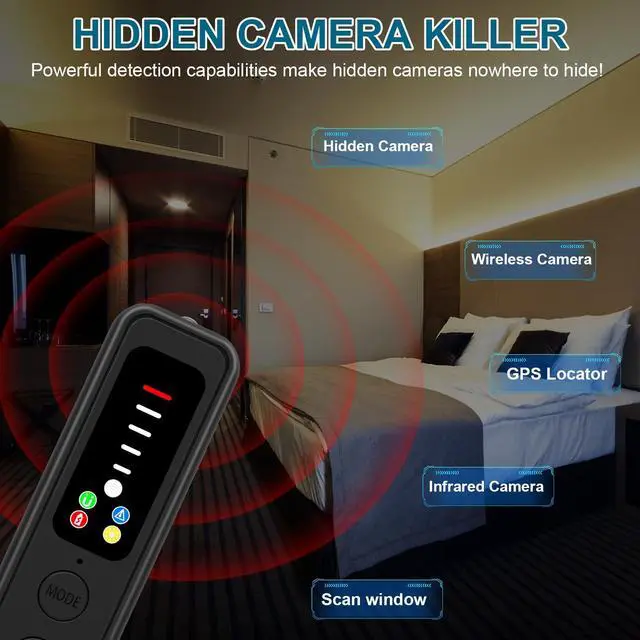 Upgraded AI Detection: Military-grade technology precisely identifies hidden cameras, listening devices, and GPS trackers. Enjoy peace of mind in hotels, offices, or even at homestay ahead of covert threats! ^^ Simple, Fast, Efficient: Power on to scan areas. Immediate alerts via sound/light alarms + LED indicators. No technical skills neededpress, scan, relax! Eliminate costly private investigatorsseconds to safeguard your safety.