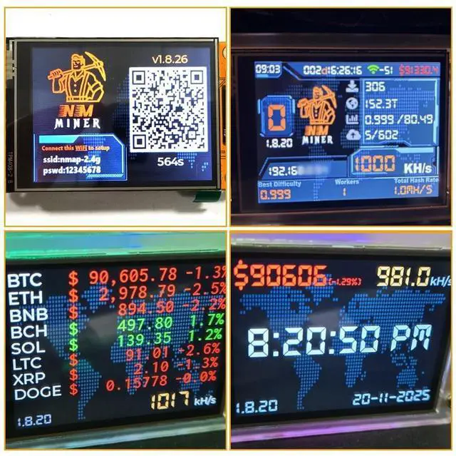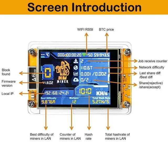Powerful Performance & Efficient Mining Designed for Bitcoin lottery mining, it delivers a hash rate of up to 1000KH/s for a smooth and stable solo mining experience. Whether you're new to cryptocurrency or an experienced enthusiast, it offers reliable performance for your mining setup, making it ideal for educational and experimental mining ^^ Ultra-Low Power & Silent Operation Featuring the low-power ESP32 core, it operates at only about 1.5W. Combined with a fanless design, it can run silently 24/7, barely increasing your electricity bill. Low power consumption also means minimal heat generation and high reliability, perfect for desktops, offices, or home environments ^^ Real-Time Monitoring on 2.8" Smart Display Equipped with a clear 2.8 -inch display, it visually and comprehensively shows real-time mining status, hash rate, power consumption, and Wi-Fi connection.
