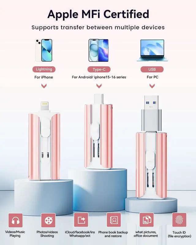 USB Stick Device: The usb drive is equipped with three interfaces, including Lightning, Type-C, and USB, allowing easy data transfer between multiple devices. No extra cables, iTunes, or iCloud are needed, so you can seamlessly switch between your phone, tablet, and computer. Free up space on your iPhone and quickly transfer files to and from your computer, making storage and sharing more efficient. Never worry about running out of storage again ^^ One-Click Backup, Enjoy
