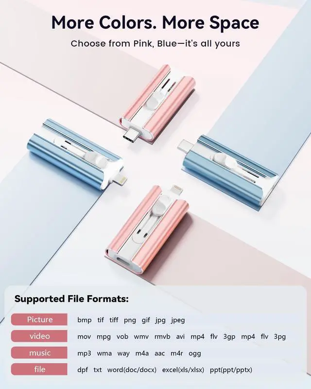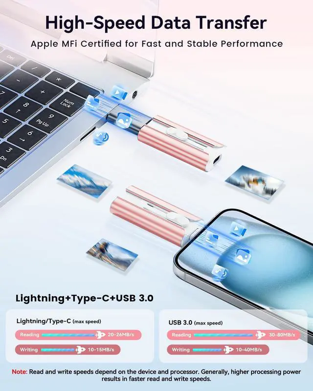 Flash Drive: Stable and reliable, providing secure storage anytime. Featuring a frosted aluminum alloy casing and advanced chip technology, it delivers excellent performance and offers a stylish look. The retractable design keeps the usb flash drive for iphones connector safe from dust and damage, while the convenient keychain makes it easy to carry.