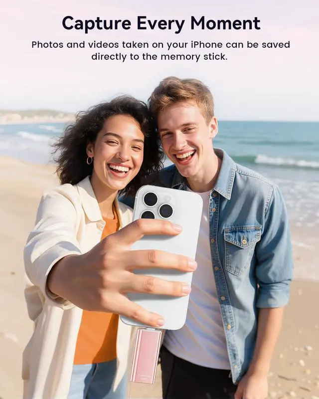 Anywhere: Easy to use, plug and play. With just one click, you can quickly back up videos, photos, contacts, and documents, eliminating tedious copying and pasting. Simply plug in your iPhone, iPad, or Android phone. Files are saved directly to the iPhone storage, freeing up valuable space. You can also share files directly from the photo stick for iphone to social media with one click, instantly sharing moments with friends and family.