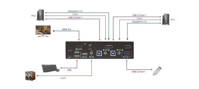 4K@60Hz Maximum ResolutionDelivers ultra-clear visuals with support for up to 4K@60Hz resolution, ideal for high-definition workspaces and media-rich applications. ^^ HDMI Monitor CompatibilityWorks seamlessly with a wide range of HDMI monitors, ensuring reliable video output across professional, home office, and multimedia environments. ^^ Built-In HDCP EngineEquipped with a hardware-based HDCP engine that prevents window resizing or display disruption during protected content switching. ^^ High-Speed USB 3.2 ConnectivityEquipped with USB 3.2 Gen 1 (5Gbps) ports and USB-A interface, ensuring stable and fast switching for keyboard, mouse, and USB peripherals across devices.