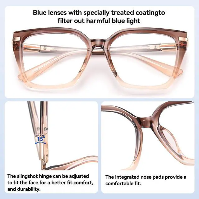 ^^: This frame blends TR90 and metal materials, striking the perfect balance between sleek looks and comfy lightweight wear. The materials make these fashion glasses for women lightweight yet durable, suitable for long-term daily wear. Perfect for screen time, work, study, or casual outingstheyll keep you comfy whether youre at home, school, the office, or on the go! ^^: Crafted for those who value both quality and fresh style, womens blue light glasses boast a clean, contemporary look that exudes a youthful and effortlessly polished feel. The subtle temple detailing adds a creative touch that enhances your side profile while maintaining the overall design's minimal and chic aesthetic. With multiple frame options available, this collection offers versatile choices to suit different preferences and personal styles.