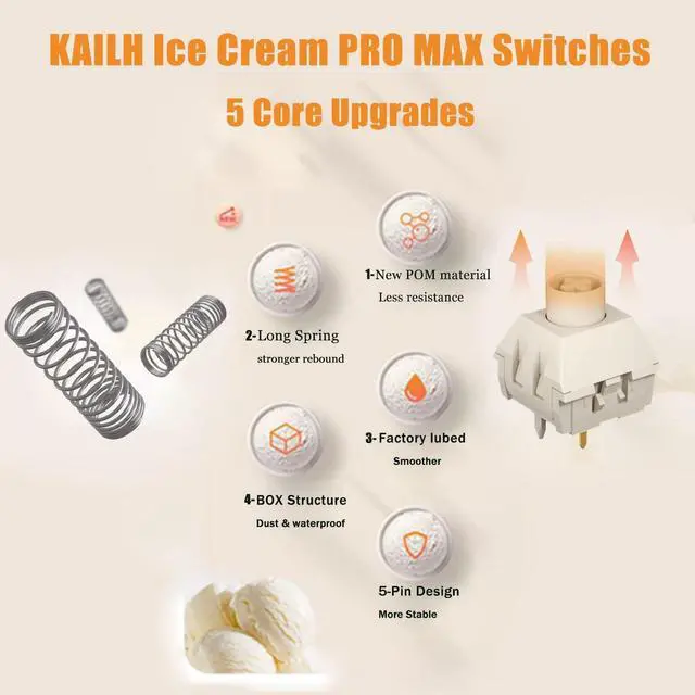 Kailh Box Ice Cream PRO Max, 5-Pin Linear Switches, factory lubed and ready to use, long spring, stronger rebound, with smooth and comfortable typing exprience, Good gaming performance.