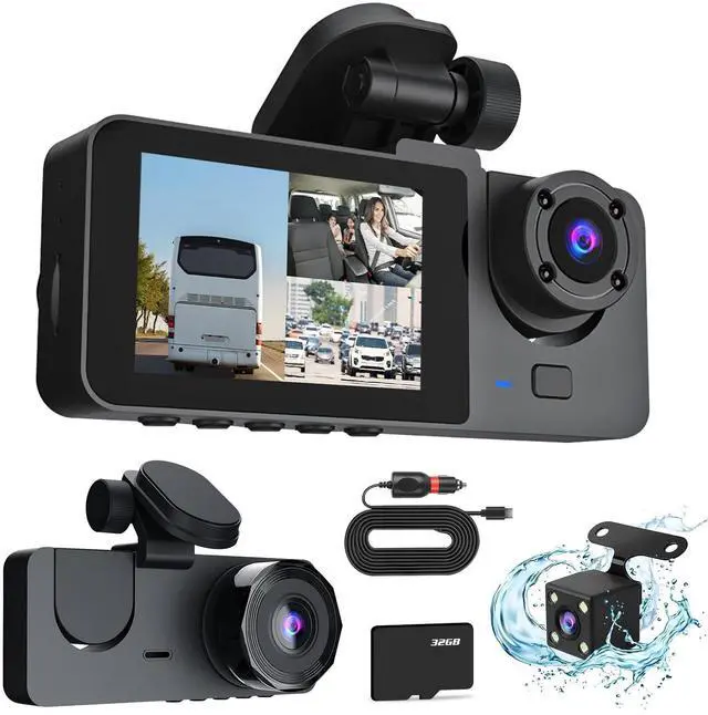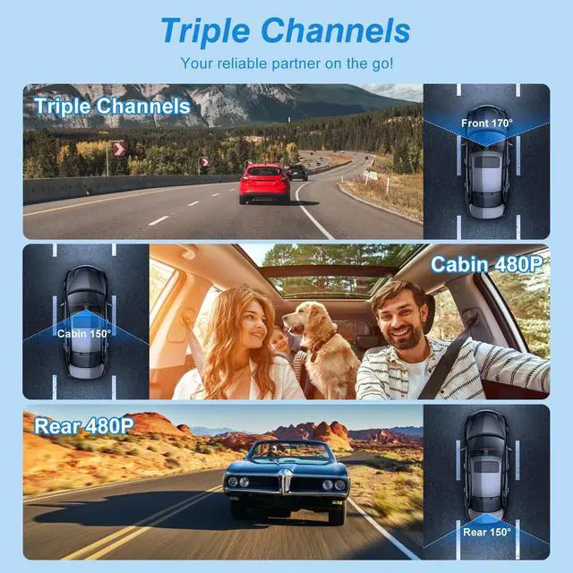 Easy Installation & Universal Compatibility: ** This **3-channel dash cam** is designed for **quick and simple installation**. Just attach the front camera to the windshield, mount the rear camera, plug it into your **cars power source**, and you're ready to go. Compact and discreet, it fits most **cars, SUVs**, and **trucks** without obstructing your view. ^^ Capture every angle of your journey with this **feature-packed dash cam**providing **reliable protection** and **peace of mind** on the road.
