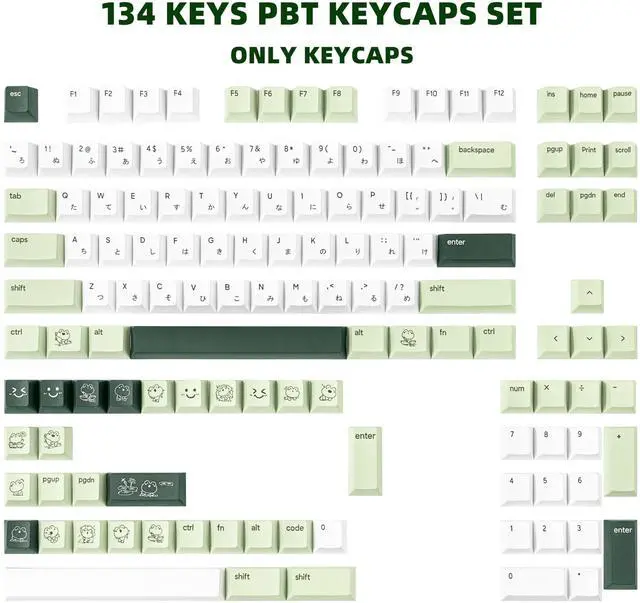 Fully compatible with all Cherry MX switches and equivalent switch types (e. g., Gateron, Kailh, Outemu). 4.5 -Sided Dye-SublimationThe matcha green keycaps design with Japanese characters and adopt advanced five-sided dye-sublimation craftsmanship, ensuring vibrant, fade-resistant colors that penetrate deep into the material. 5. Custom Keycaps TipsIncluded in the package: 134 PBT keycaps and 1 keycap puller for easy installation.