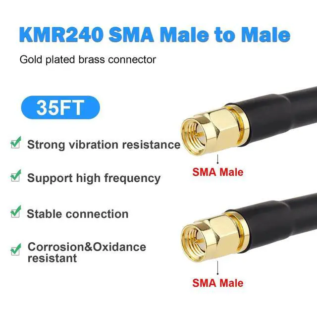 Cable type: KMR240. ^^ [Ultra Low Loss]-The KMR240 jumper cable is bigger than RG58 cable, so it could transmit data with lower signal attenuation that low to - 2.65 db(25ft, 1800MHz) and keep VSWR 1.15. ^^ [Firm Connected]-We fix the connector with 2.2" adhesive tube and it will not easy to fall off from the cable. And that can provide a heavy duty and firmly connection, really durable and professional coaxial cable. ^^ [High Grade Material]-This KMR240 SMA cable inner conductor is made by pure copper and build with tinned copper braid, that can make sure the signal transmission efficiently and stable. The PVC jacket is waterproof and has strong oxidation resistance, and can be adapted to outdoor for a long time ^^ [Widely Application]-Compatible with all SMA-based equipment, including splitter, antenna, modem, RF radio, GPS, and 3G/4G/LTE Network system etc.