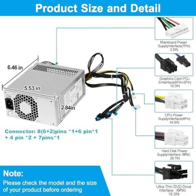 Output: 500W, Connector: 4 pin *3, 6 pin*1, ( 2+6)pin *1 and 7pin*1. The L05757-800 500W Power Supply is 100% New and unused, each item has been tested and in good condition before shipping.