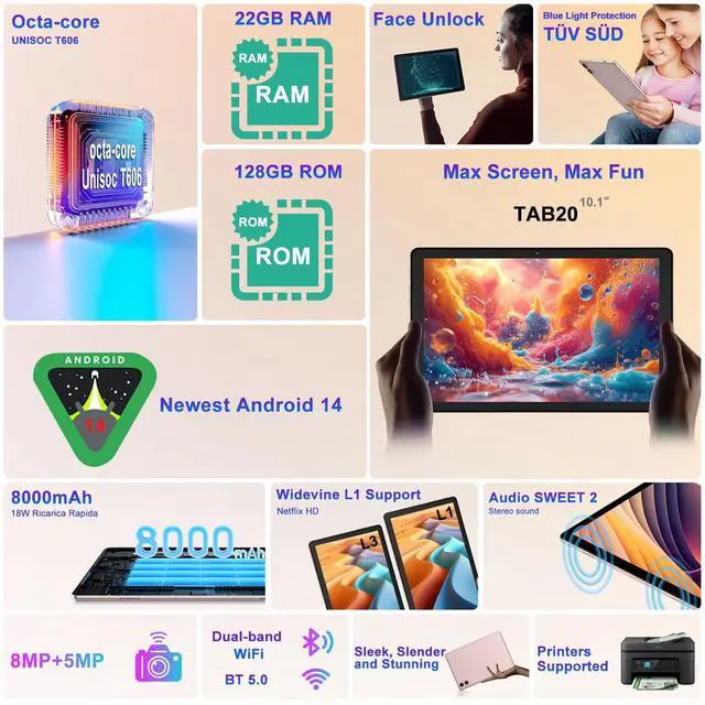 2025 Newest Android 14The TAB20 tablet, powered by the latest Android 14 operating system, has seen upgrades in multitasking and customization settings. It features a high-performance 8-core processor with a 2.0 GHz frequency, delivering excellent performance for both work and play. requires WiFi conditions and does not support SIM cards ^^ 22GB RAM + 128GB ROM + 1TB microSD This Android 14 tablet boasts an impressive 22GB (6GB + 16GB) of RAM and 128GB of ROM, providing ample space to store a large number of photos, videos, and documents. It also supports up to 1TB of microSD card expansion for additional storage space.