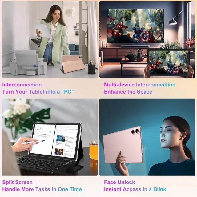 Certified with Widevine L1, it efficiently decodes FHD and Ultra FHD video, supporting 1080P FHD playback on popular platforms such as Netflix, Prime Video, Disney+, and YouTube ^^ Additional FeaturesThe split-screen function allows users to run multiple applications simultaneously, enhancing multitasking efficiency. The tablet also supports casting, so you can project its content directly onto your TV for a larger and clearer screen with improved acoustics. Additionally, it includes advanced face recognition technology, enhancing user experience and adaptability