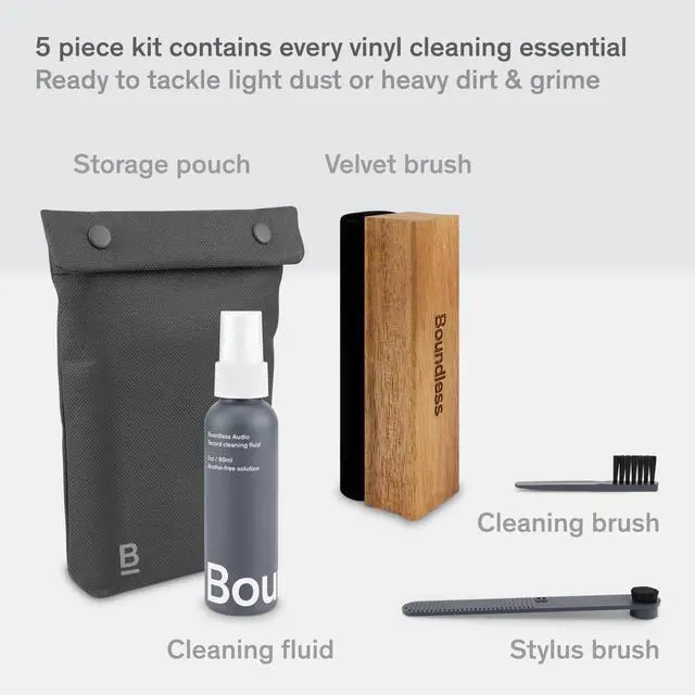 Clean and protect your vinyl collection Our vinyl record cleaning kit is the simple and safe way to remove dirt, dust, grime and fingerprints from your records. Maximize your vinyl experience by restoring sound quality and enjoy pop, click and hiss-free listening. ^^ 5 piece kit contains all vinyl cleaning essentials LP vinyl record cleaner kit includes velvet record brush, 2oz/60ml alcohol-free record cleaning solution, carbon fiber stylus cleaner brush, nylon cleaning brush and snap-close storage pouch. Relax knowing youre always ready to tackle even the dirtiest vinyl quickly and easily.