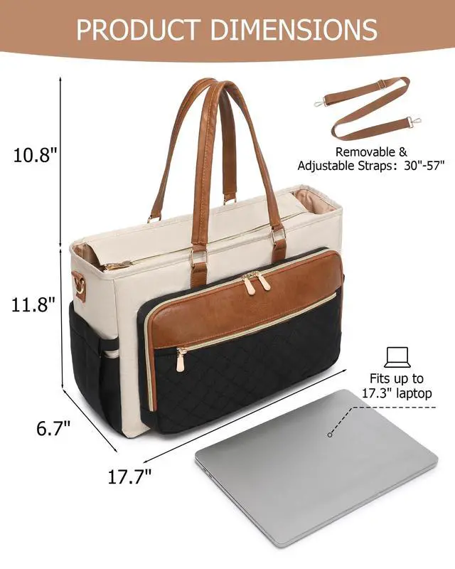 ^^ 17.3" Laptop Compartment: This laptop tote measures 17.7 " 6.7 " 11.8 " (L W H) and features an adjustable shoulder strap (30 "to 57 "). The interior includes a padded, shockproof laptop compartment, providing excellent protection for 15.6 -inch laptops. Other pockets can be used to store books, notebooks, cosmetics, and other items.
