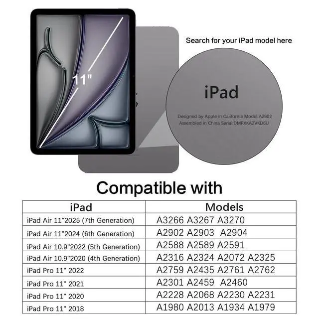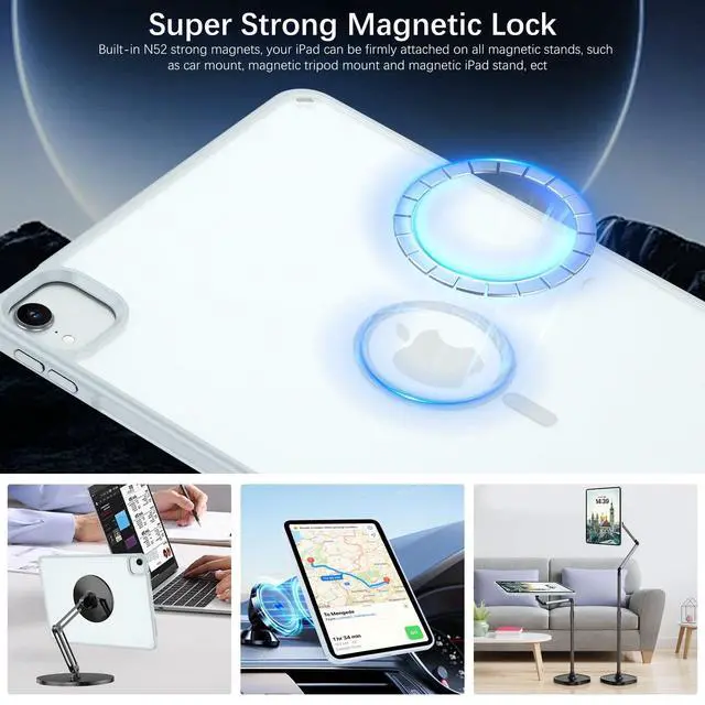 Pro 11: A2759, A2435, A2761, A2762, A2377, A2459, A2301, A2460, A2228, A2231, A2068, A2230, A1980, A2013, A1934, A1979 ). Please check back bottom of your iPad to find the model number "Axxxx". (Not for iPad Pro 11 (M4) 2024!! ) ^^ The Use of Multiple ScenariosThis magnetic case for iPad Air 11 inch(M3/M2)/iPad Air 5th Gen/iPad Air 4th Gen is equipped with industrial-grade N52 high-strength magnets, allowing for multiple scenarios. You can attach your iPad on all magnetic stands firmly, such as such as car mount, magnetic tripod mount and magnetic iPad stand, ect. (Note!!! Not for Magsafe charging!! ) ^^ Heat Dissipation Holes3 heat dissipation holes can help your iPad dissipate heat in a timely manner and extend the lifespan of the your iPad Air 11 inch(M3/M2)/iPad Air 5th Gen/iPad Air 4th Gen. ^^ Protection for Camera & ScreenRaised lip on both front and back provide a perfect protection to screen and camera against scratch when placed down without making your iPad Air 11 inch(M3 2025/M2 2024) bulky. ^^ Strong Protection & Premium MaterialsMade of matte acrylic back and a flexible TPU frame, provide a perfect protection against fingerprints, scratches and drop while maintaining its original beauty.