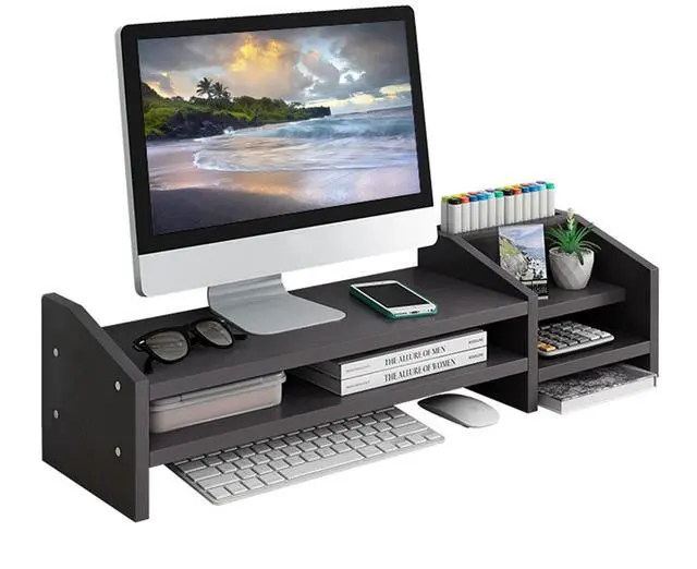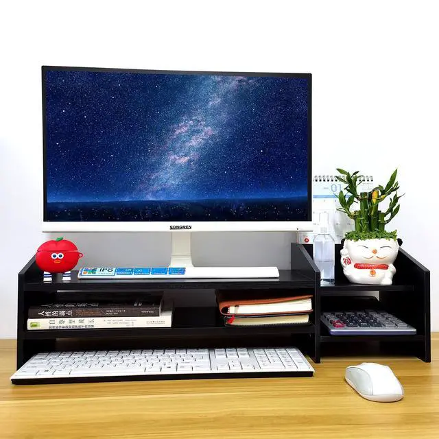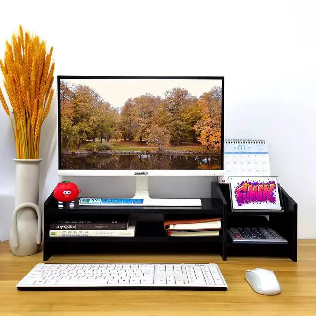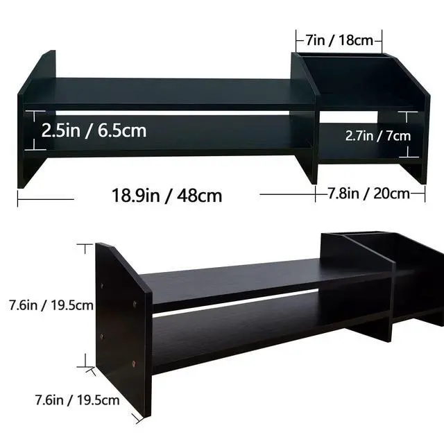 Comfortable viewing angleBy raising the monitor to the right height, the desktop monitor riser helps people maintain a correct posture when using the computer, reduces the pressure caused by cervical downward pressure, and makes the office more comfortable and enjoy a comfortable viewing angle ^^ Organize the desktopThis monitor Stand bracket is designed to divide the functional area, and there is also a two-layer storage shelf on the right side of the bracket. It can better place office supplies, make it more convenient to take items, improve space utilization, increase work efficiency, and let you experience a comfortable life ^^ Save spaceThere is a mezzanine in the middle of the part where the computer monitor is placed, as well as additional storage space under the bracket, which can store some important documents and books, and the bottom space can be used to store the keyboard and mouse to achieve the effect of dust protection ^^ High quality materialThis desktop shelf combination is made of eco-friendly high-quality wood, and the monitor Stand made of thicker wood is stronger than plastic and durable.