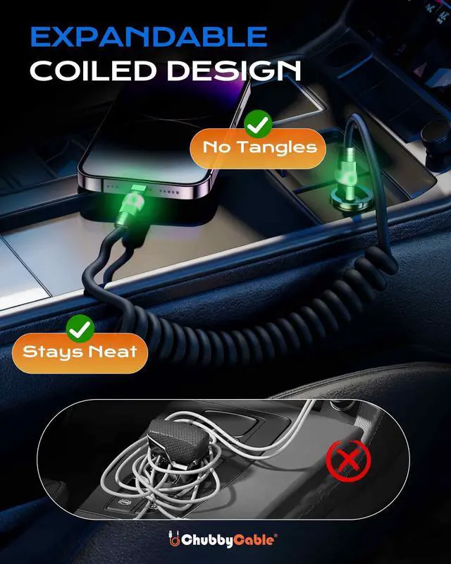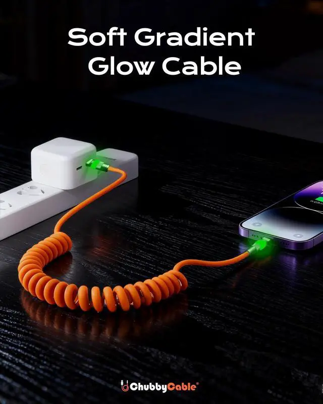 Gradient RGB Illumination: Light up your charging routine with the ChubbyCable Neon Glow Coiled USB-C Cable. Its gradient RGB illumination transitions smoothly between colors, creating a futuristic visual effect that enhances your setup while indicating the charging status with subtle brilliance ^^