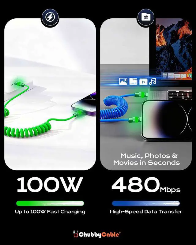 CHARGING & DATA TRANSFER: The ChubbyCable coiled USB-C cable delivers up to 100W of charging for your devices. Supporting USB 2.0 data transfer speeds up to 480 Mbps, this fast charging USB C cable allows for quick and reliable file syncing across all your compatible devices ^^