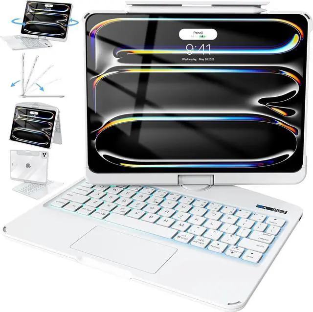 Intermerge for iPad Pro 13(M4,2024) Case with Keyboard Clear,360 Rotatable Multi-Touch Trackpad,7-Color Backlit Magnetic Keyboard Case with Pencil Holder and Type-C Charging - White