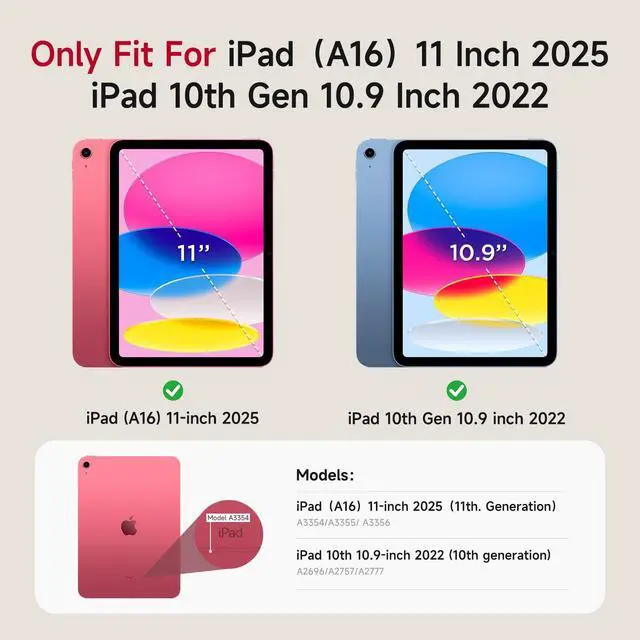 Compatibility: Preciously designed for iPad A16 11th Generation (11 Inch, 2025) (Models: A3354/A3355/A3356 ); for iPad 10th Generation (10.9 Inch, 2022) (Models: A2696/A2757/A2777). Note: It will not be compatible other model. Please check your iPad model before purchase.