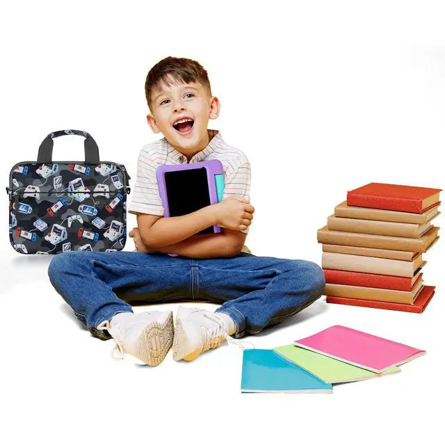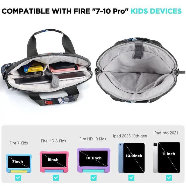 Dimension: 13 X 9.8 X 1.3 inches, inner sleeve fits up to 11.8 inches, with Shoulder Strap, fits most standard tablets 8-10". Easy to carry. ^^ Zipper closure, Water-resistant polyester. Tablet bag for kids, Compatible for Fire Kids Edition, Fire HD 10 Pro, Fire HD 8 Pro, Fire 7, Kindle, chromebook tablet, samsung tablet, android tablet, e-readers. Also fits iPad 10.2 (7th/8th/9th gen) & iPad mini ^^ Kids tablet accessories, fit for tablet 8-10inch. Padded sleeve and soft lining help protect from bumps and scratchesgreat for daily use by kids. ^^ Tablet pouch for child, headphones charging cables, and more. Front pocket keeps charger, cables, earbuds/headphones, stylus and small essentials organizedno more lost accessories. ^^ Practical tablet bag for kids for boys and girlsperfect gift for kids (birthday, Christmas, back to school, travel). A smart everyday tablet case bag parents will love.