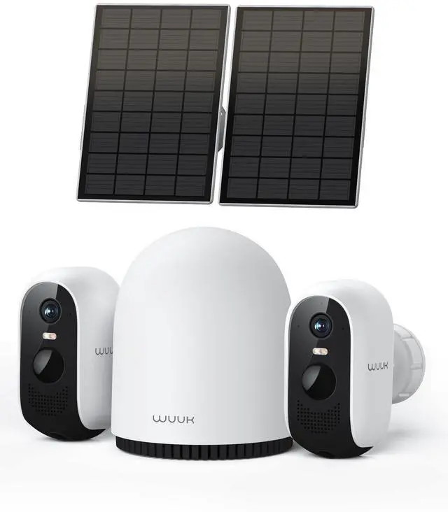 Secure and Private Local Video Storage - WUUK Base Station with 32GB built-in memory can store about 4 months of video data without monthly fee, which is only accessible to you and those you share access with. One WUUK Base Station can be paired to up to 8 wireless cameras (outdoor camera or doorbell camera) and share the storage. ^^ Forever Power - Equipped with solar panels and a larger battery capacity, WUUK outdoor security camera is designed for working in various weather conditions. Non-stop solar-powered, forever home guard, no need to take the cameras down to charge.