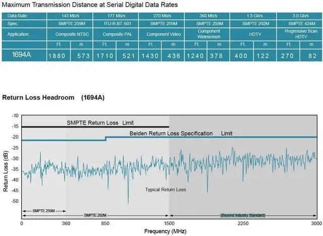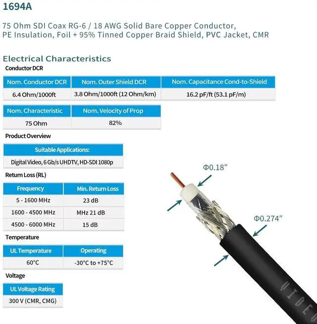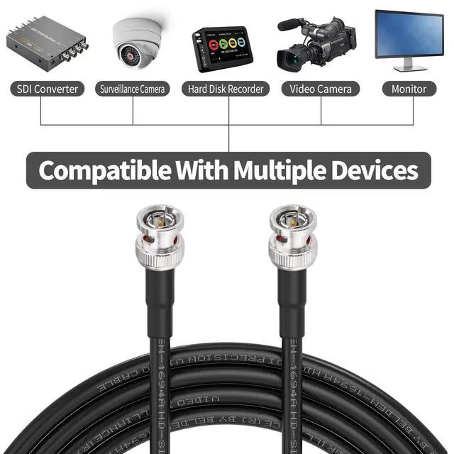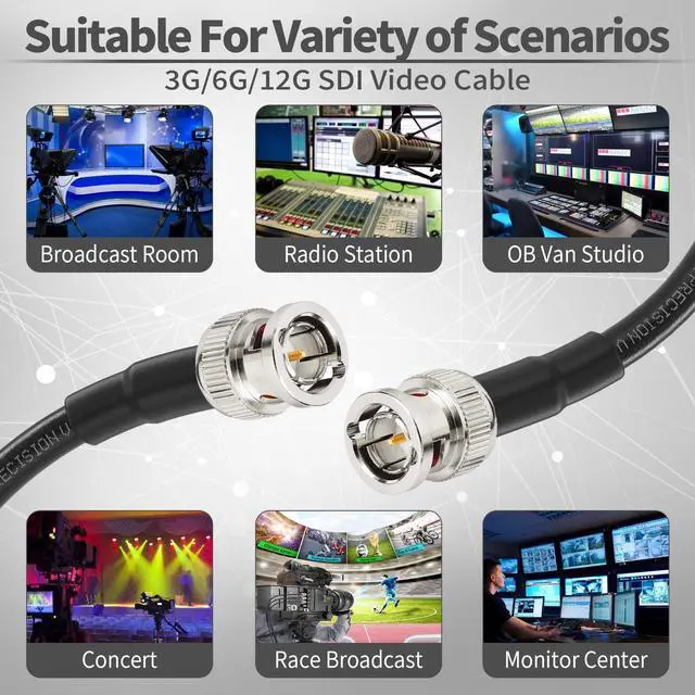 Connector: Gold plated ^^ Standard Definition SD-SDI (270 Mbps, ST 259) HD standard HD-SDI ( 1.483 Gbps, ST 292)3G-SDI ( 2.97 Gbps, ST 424) 6G-SDI ( 5.94 Gbps, ST 2081) 12G-SDI ( 11.88 Gbps, ST 2082) ^^ BELDEN 1694A PRECISION SERIAL DIGITAL VIDEO COAXIAL CABLE: features exceptionally low attenuation and a 4.5 GHz Bandwidth in an RG6 coax cable. Featuring RG-6/U type, 18 AWG solid. Professional SDI video cable provides fast, stable and secure video signal transmission, suitable for outdoor installations ^^ This long sdi cable Is suitable for HDTV and professional