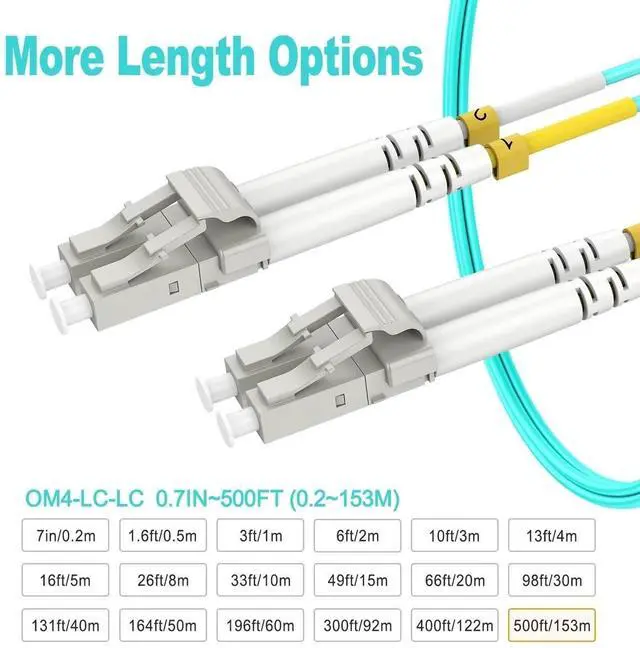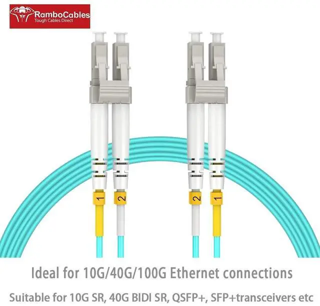 500ft/150m OM4 LC-LC Fiber Patch Cable RamboCables 500ft/150m OM4 LC multimode duplex fiber has a 50/125m high rated fiber cladding, 850/1300nm Wavelength, This high quality 50/125m OM4 multimode LC to LC fiber patch cables ensure a more stable and efficient network for you. ^^ Wide UsageOM4 MMF is the preferred fiber specification for 40G Ethernet connections. OM4 LC to LC Multimode Duplex Fiber patch cords is specially designed for connecting 10G SR, 40G BIDI SR, QSFP+, SFP+ transceivers etc, ideal for 10G/40G/100G Ethernet connections. RamboCables OM4 LC-LC optic fiber patch cables help saving more space for your high density cabling in data centers, enterprise networks, telecom room and any places patch cables are needed.