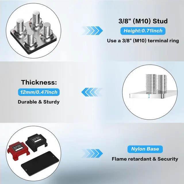 Easy Installation: Our battery bus bar is suitable for installation on any plane; Stainless steel screws and nuts have corrosion resistance and rust resistance; The anti slip sponge on the base enhances stability. Reserved wiring holes on three sides for easy wiring ^^